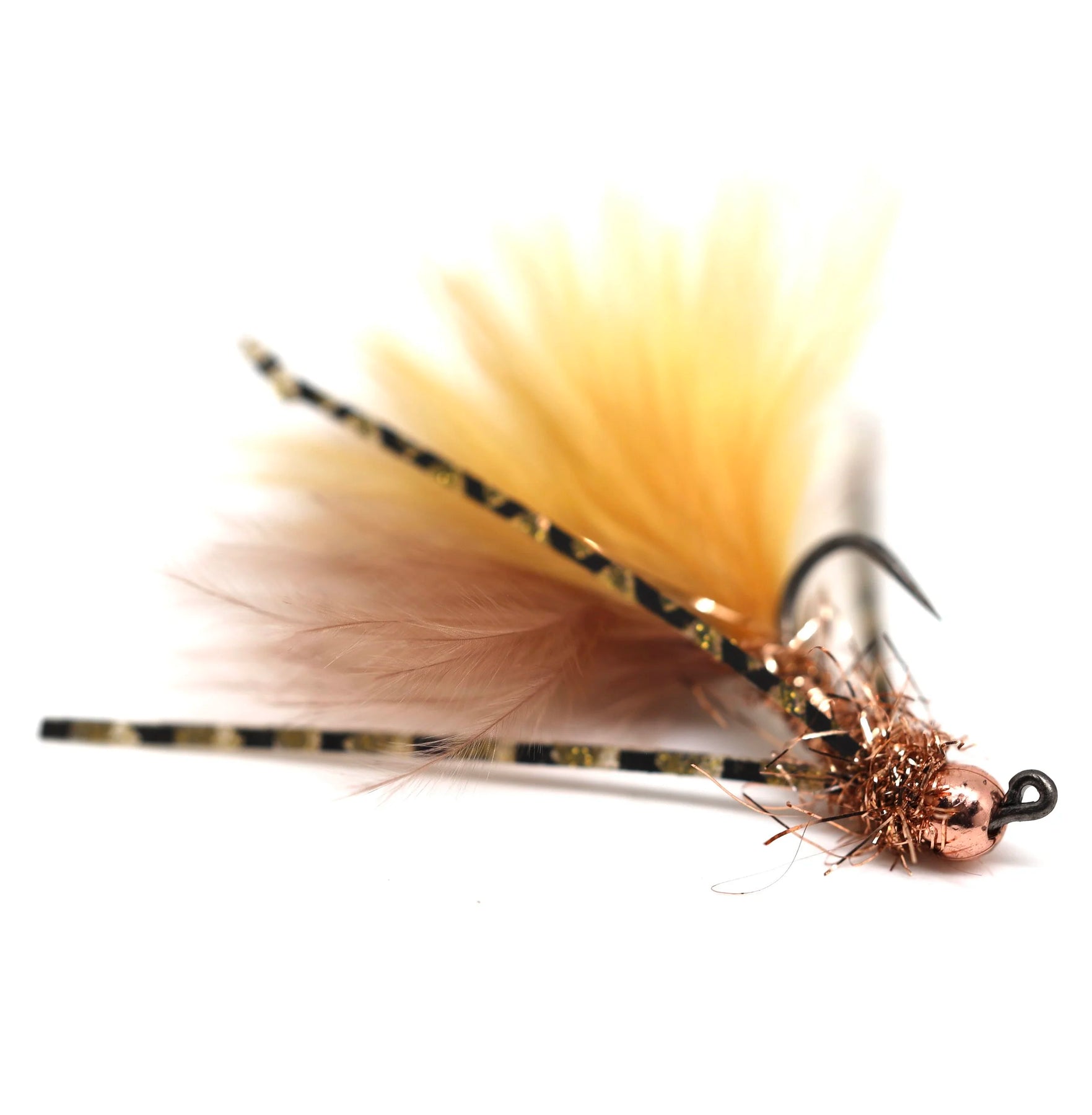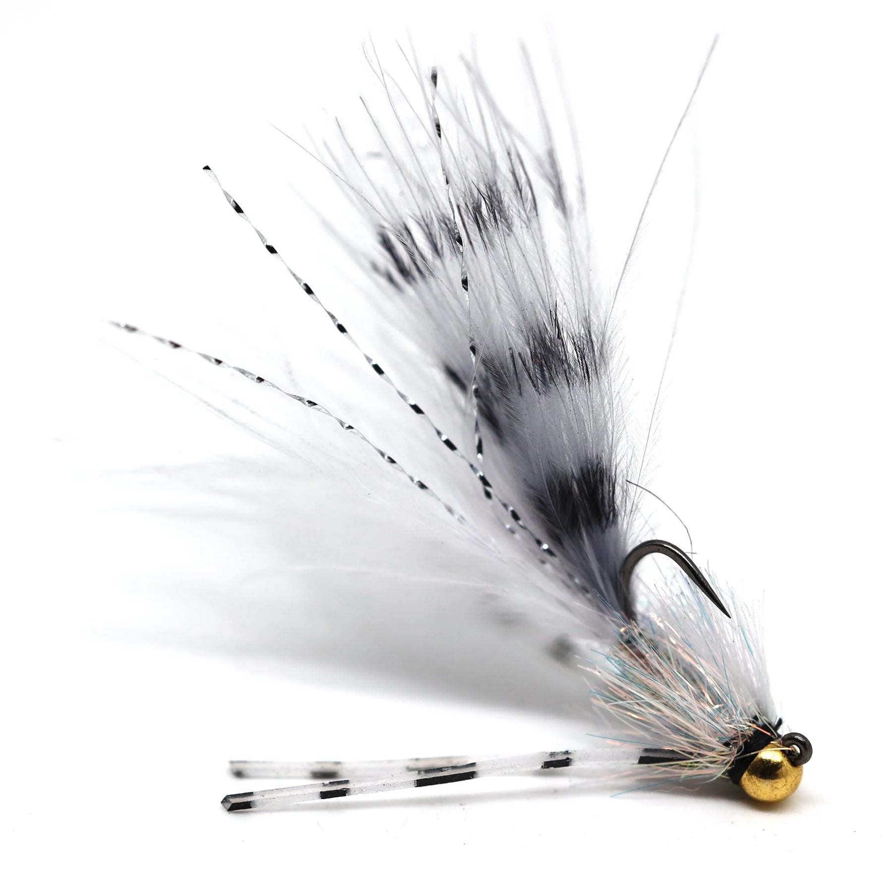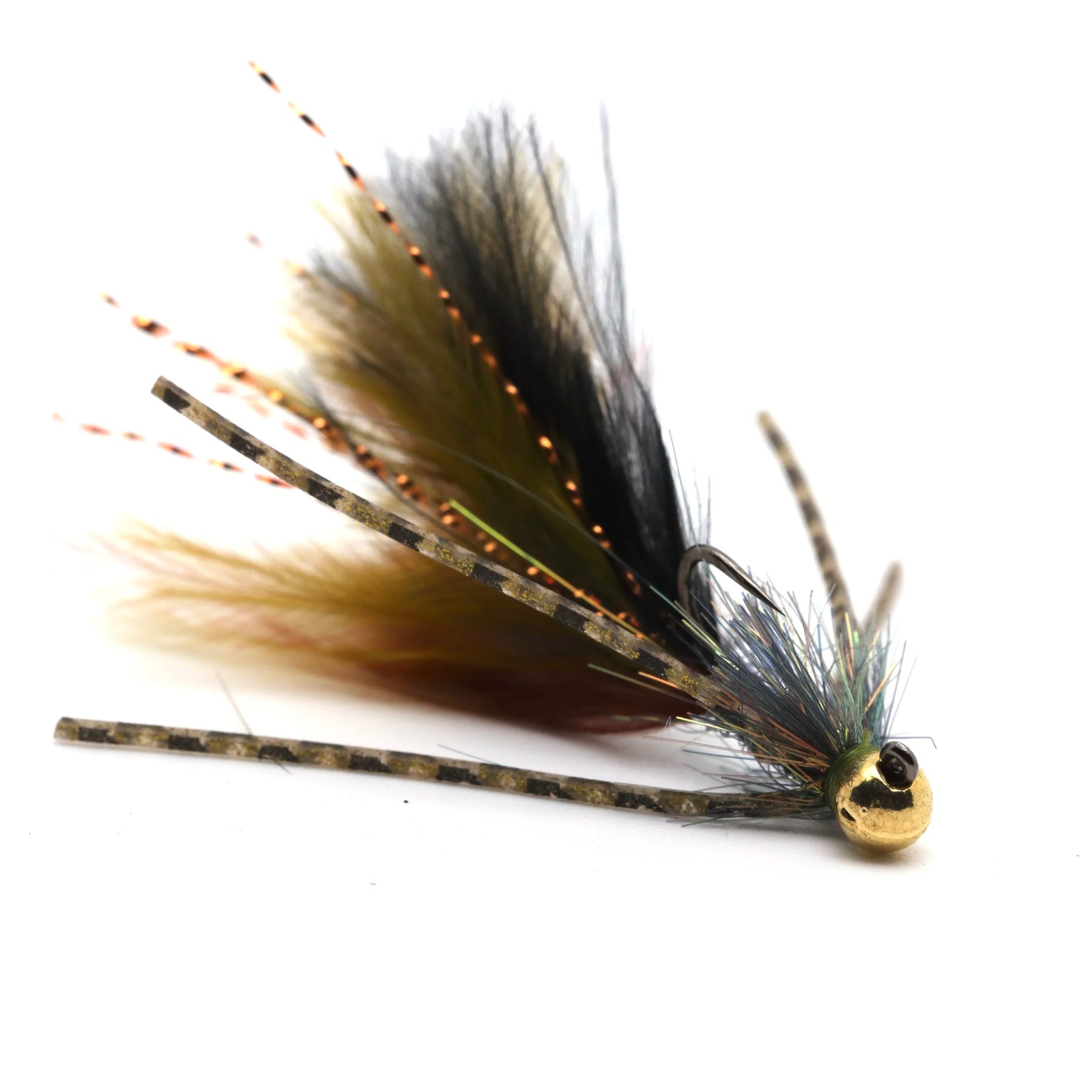 Try this flashy jig streamer in high water or when you need to get deep quick. Size #12 hook with slotted tungsten bead. These fish well stripped, swung, or dead drifted under an indicator.